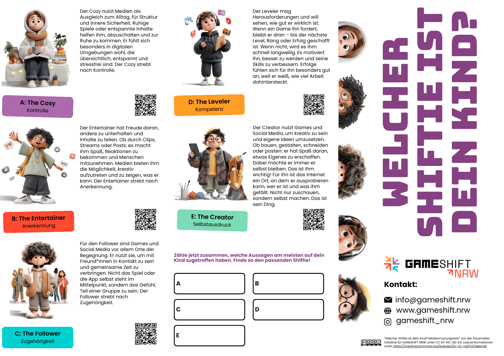 Die Ergebnisse zeigen, welchem Mediennutzungstyp das Kind am ehesten zugehörig ist. Unsere Shifties stehen stellvertretend für unterschiedliche Bedürfnisse, die hinter dem Medienverhalten stecken können, laden dazu ein, sich selbst und einander besser kennenzulernen und regen zu einer bedürfnisorientierten Medienerziehung ein.